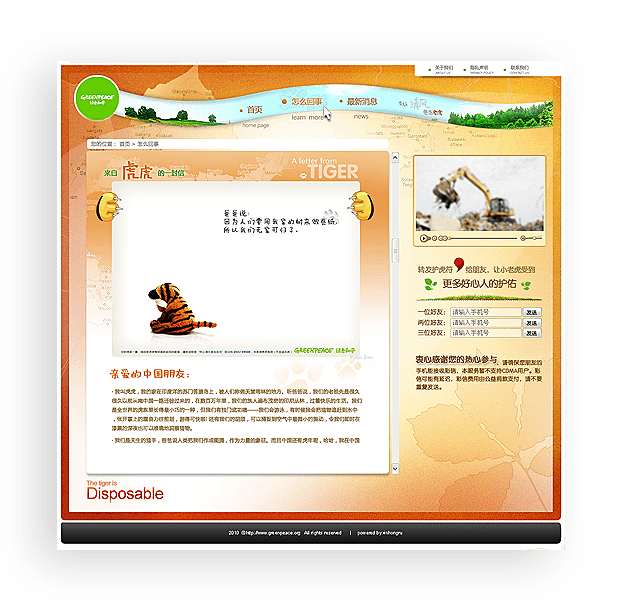 綠色和平網(wǎng)站舉辦《別讓清風(fēng)卷走老虎》等多個(gè)線上公益活動(dòng),吸引用戶參與。新鴻儒長(zhǎng)期負(fù)責(zé)其網(wǎng)站的維護(hù)和運(yùn)營(yíng)推廣工作,保障網(wǎng)站穩(wěn)定、有效運(yùn)行。