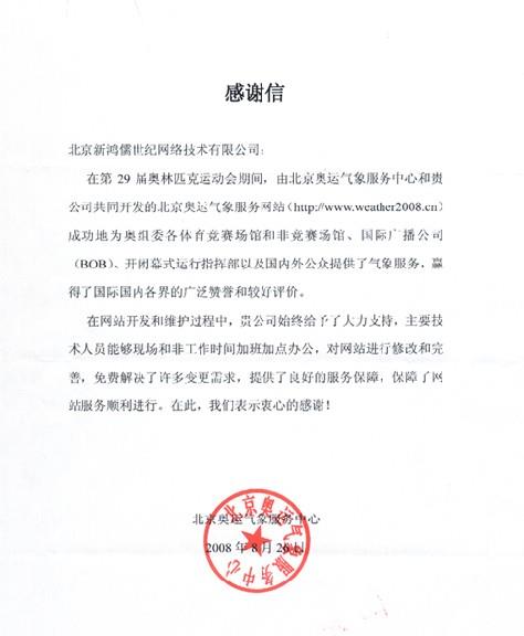 北京奧運氣象服務中心在此次項目中看到了新鴻儒的實力和努力! 并對北京奧運會氣象服務網(wǎng)站高度滿意,特此發(fā)來表揚信,以示鼓勵和贊揚!