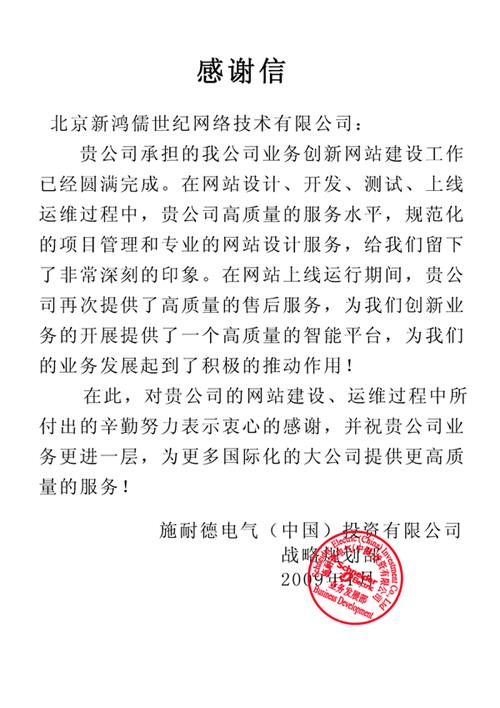 2009年1月施耐德電氣特此發(fā)來了表揚(yáng)信,這是對我們工作的認(rèn)可,也是對我們?nèi)蘸笄靶邪l(fā)展的鼓勵,簡簡單單的幾句評價就為新鴻儒的前行增添了力量。新鴻儒堅信不會辜負(fù)客戶的希望,會在不斷改善自己的同時,飛得更高做得更好來回饋給你們。