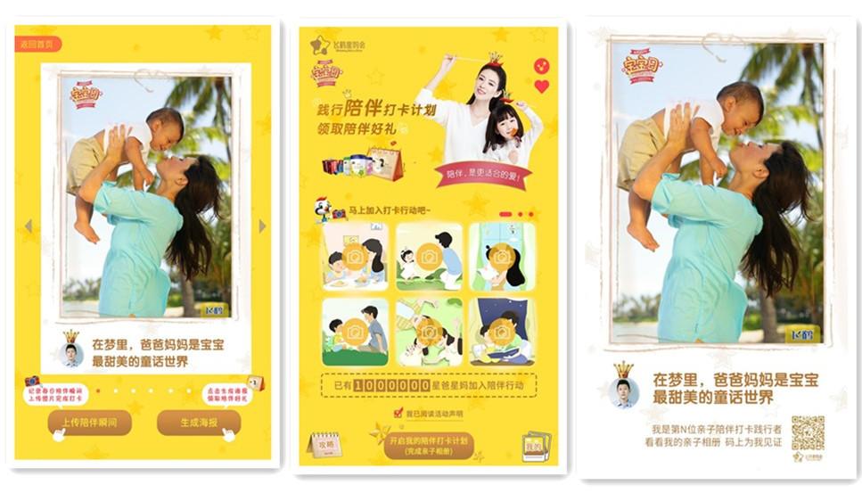今年是飛鶴倡議“5.28中國寶寶日”的第二年,飛鶴從陪伴號(hào)召升級(jí)為陪伴指引,打造更適合的陪伴范本。通過H5互動(dòng),線上+線下有機(jī)聯(lián)動(dòng),發(fā)起了全民陪伴行動(dòng):線上陪伴習(xí)慣養(yǎng)成打卡。引導(dǎo)寶爸寶媽每天上傳自己陪伴寶寶的瞬間,即刻生成專屬海報(bào),不僅可以在社交網(wǎng)絡(luò)進(jìn)行分享、曬親子照,還可參加抽獎(jiǎng)、邀請(qǐng)好友助力。 7天一個(gè)循環(huán),21天養(yǎng)成陪伴寶寶的好習(xí)慣。