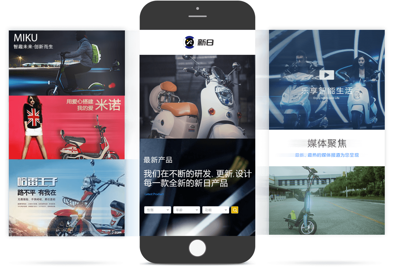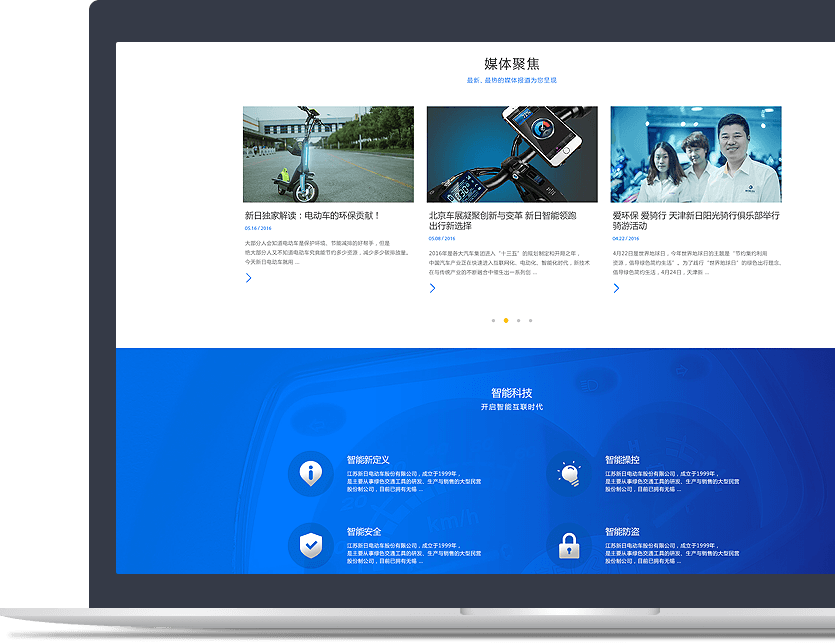 新日電動車官網(wǎng)以品牌為核心,以產(chǎn)品為基礎,通過JS/CSS3交互技術、全屏視頻等方式, 塑造企業(yè)創(chuàng)新、智能的品牌形象。