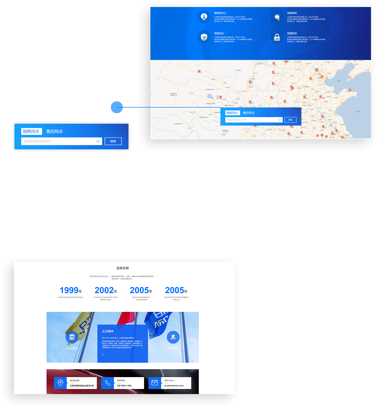新日電動車官網(wǎng)調(diào)取百度地圖實時數(shù)據(jù),通過標簽定位的方式,實現(xiàn)銷售網(wǎng)點、售后網(wǎng)點的查詢,極大的方便了用戶,提升了服務質(zhì)量和銷售渠道。