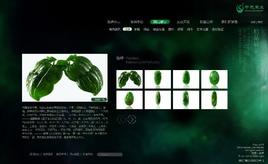 開(kāi)元玉業(yè)有限公司位于馳名中外的中國(guó)玉雕之鄉(xiāng)——河南·鎮(zhèn)平,是目前國(guó)內(nèi)碧玉加工行業(yè)的領(lǐng)軍企業(yè)。公司主營(yíng)玉器、珠寶、首飾等產(chǎn)品, 是唯一一家以規(guī)?;?、企業(yè)化、品牌化運(yùn)作的集玉料采集、產(chǎn)品研發(fā)、生產(chǎn)、批發(fā)銷(xiāo)售及玉文化傳播為一體,面向全國(guó)的大型玉雕專(zhuān)業(yè)公司。依靠精湛的工藝、人性化的銷(xiāo)售站穩(wěn)市場(chǎng),依靠完善的售后服務(wù)贏得信譽(yù),依靠“五大保障”確??蛻衾?根據(jù)“三方收益”的原則逐步完善公司體系。